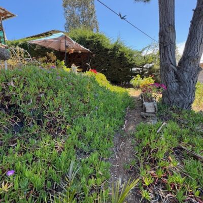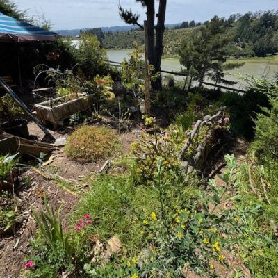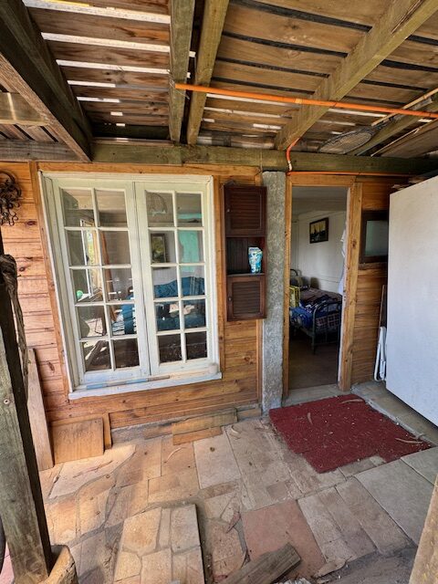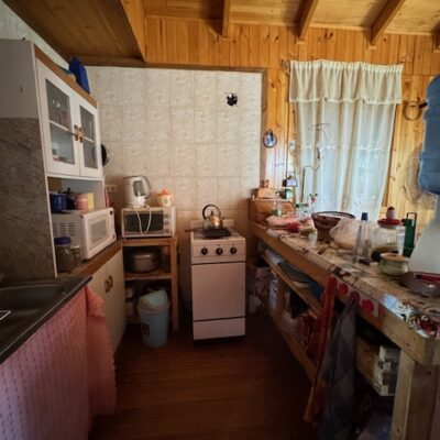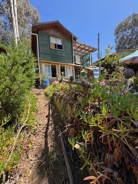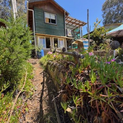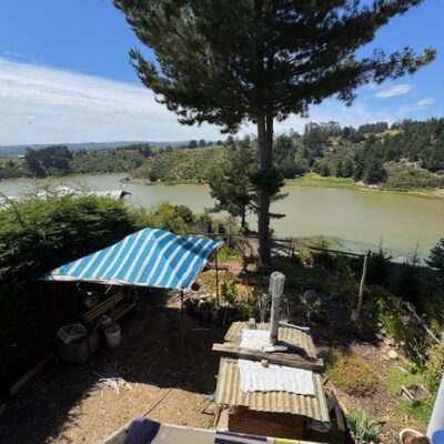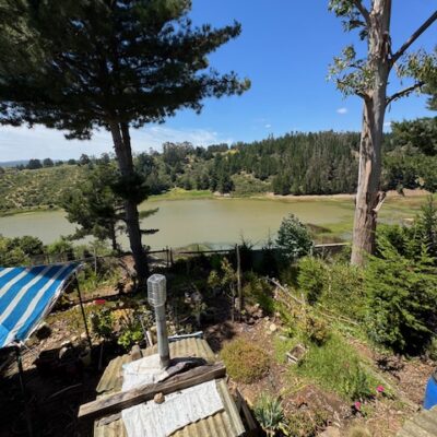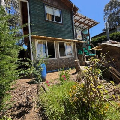 Cabaña de madera de aprox 70 m2 con 3 habitaciones , jardín y patio con vista a la laguna .