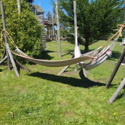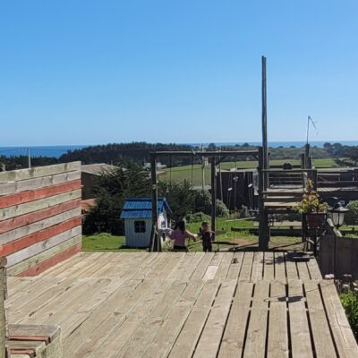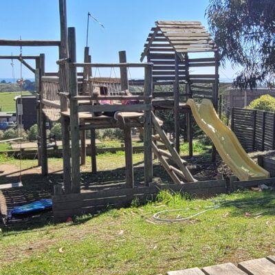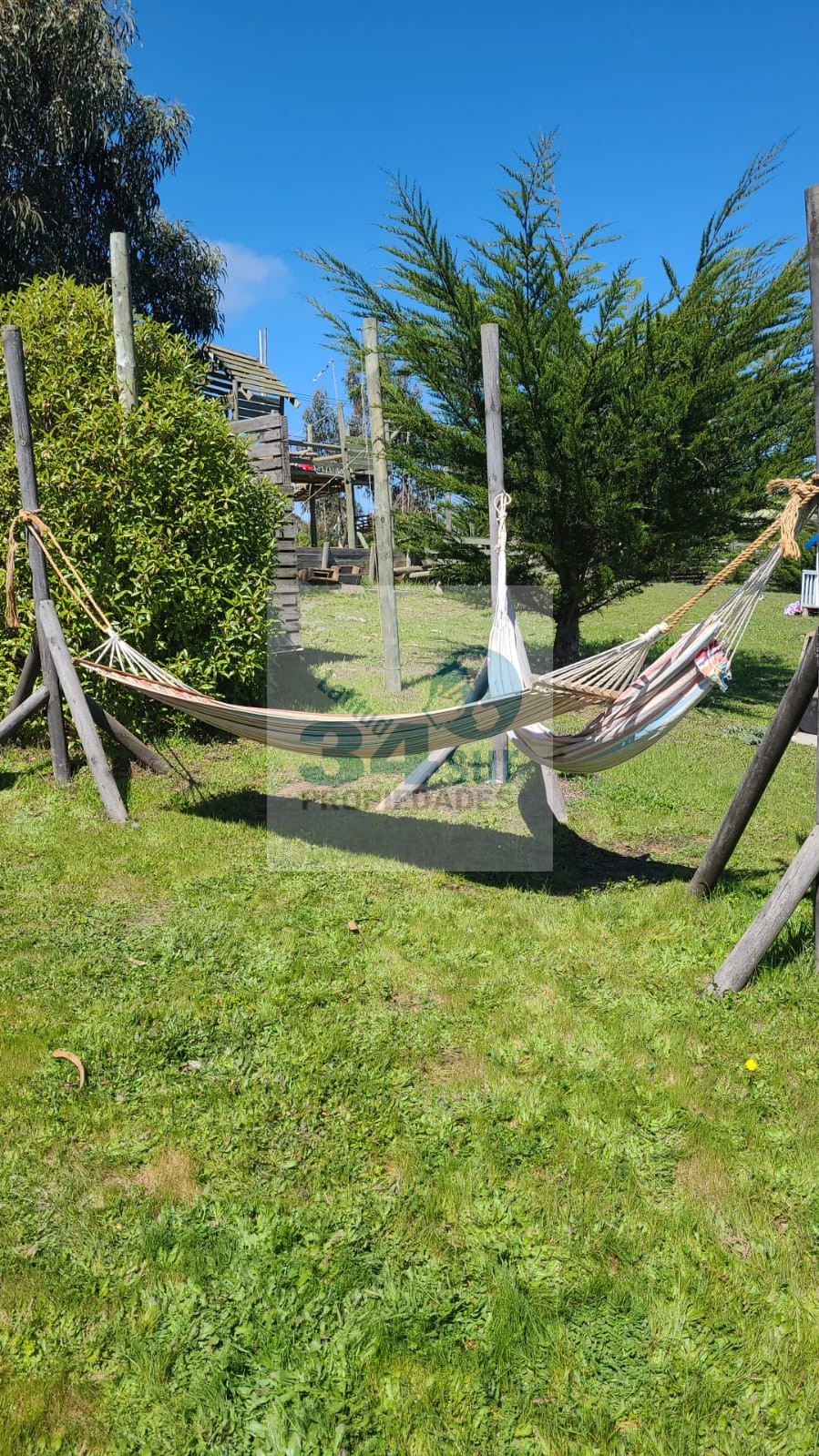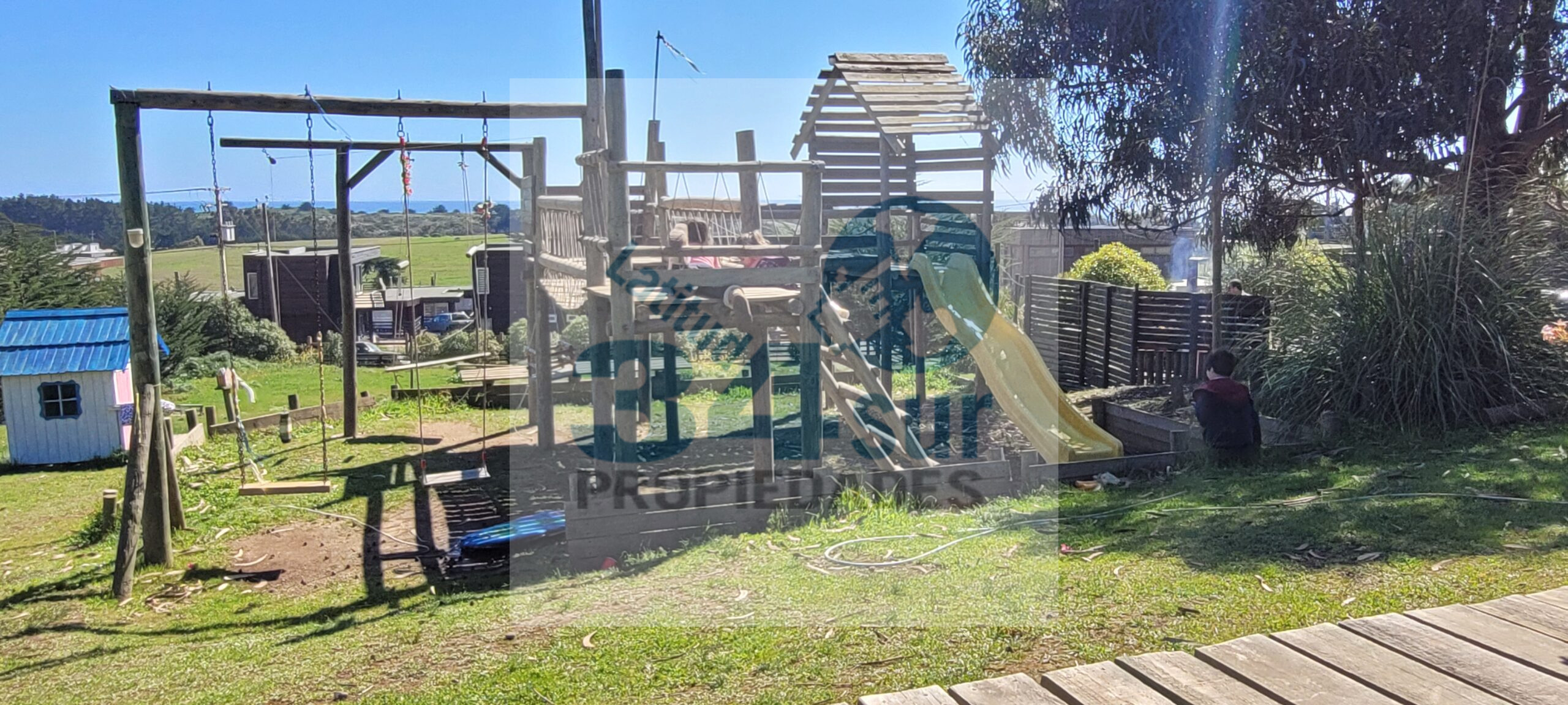El cierre perimetral de madera y los juegos infantiles añaden un toque adicional a esta propiedad que ya cuenta con permisos de obras y recepción final tanto para la vivienda como para las cabañas.